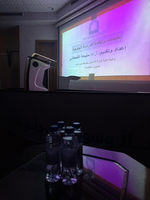 بعد ذلك قدّمت وكيلة الكلية لشؤون الطالبات أ.د. مليحة القحطاني تعريفًا بأهمّ واجبات الطالبة الأكاديمية، وحقوقها في الجامعة، مصحوبًا بشرح أبرز الإجراءات الأكاديمية، مثل: آليّة الغياب والحرمان، وطريقة الاعتذار عن المقرر أو الفصل، أو تأجيل الفصل، وطريقة التقديم لذلك، وغيرها من الإجراءات الأكاديمية التي تهمّ الطالبة.