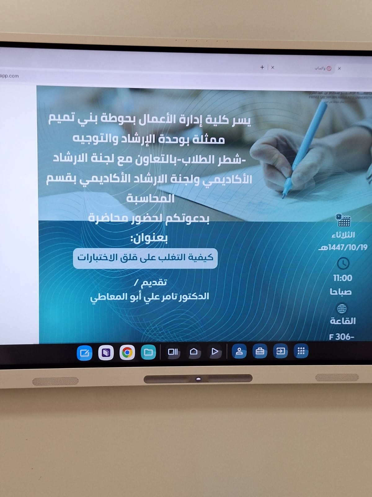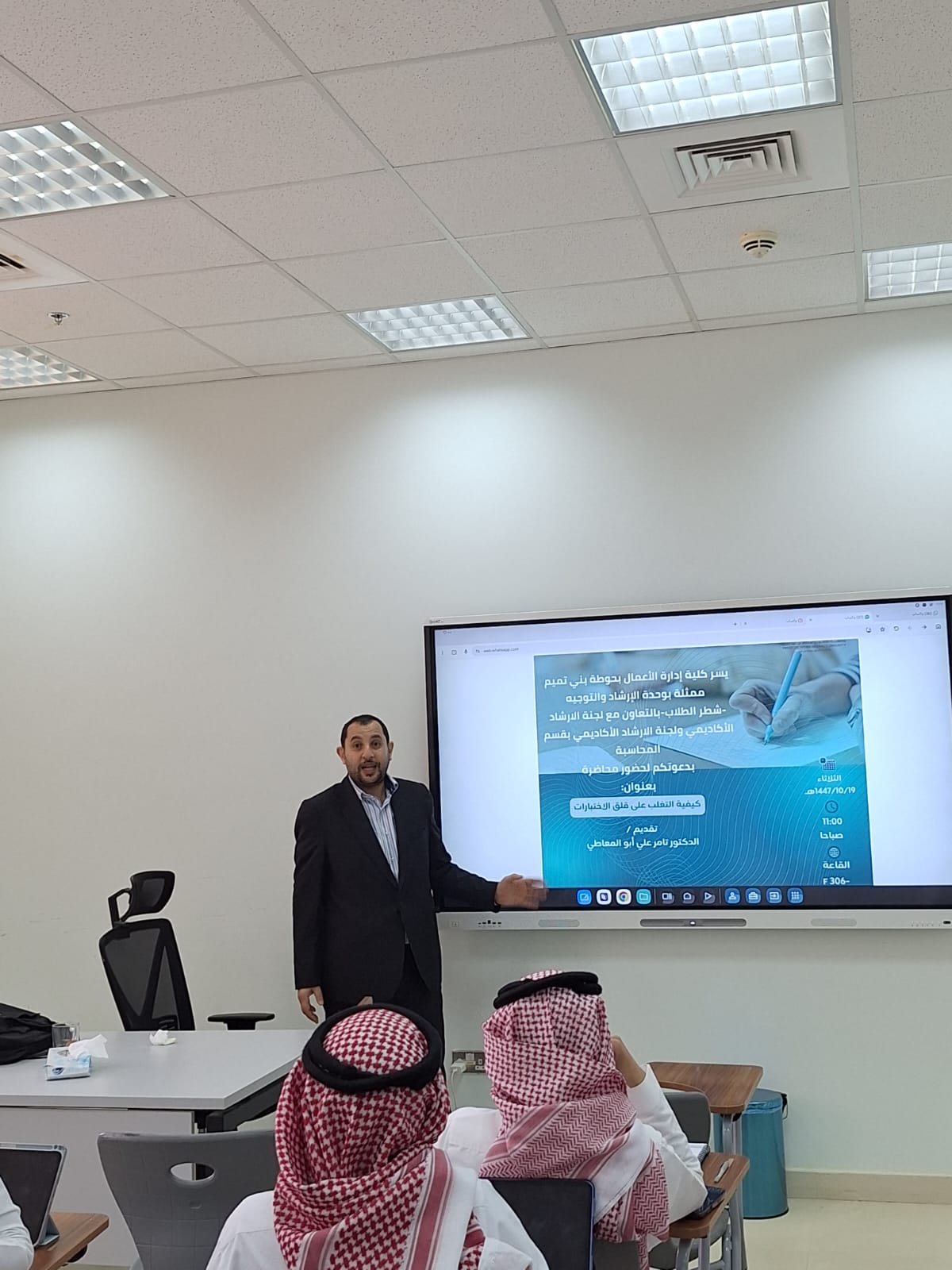 نظمت الكلية، ممثلة بلجنة التوجيه والإرشاد بشطر الطلاب، وبالتعاون مع لجنة الإرشاد الأكاديمي ولجنة الإرشاد الأكاديمي لقسم المحاسبة، يوم الثلاثاء الموافق 19/11/1447هـ، فعالية توعوية بعنوان “كيفية التغلب على قلق الاختبارات”، قدّمها الدكتور تامر علي أبوالمعاطي.
