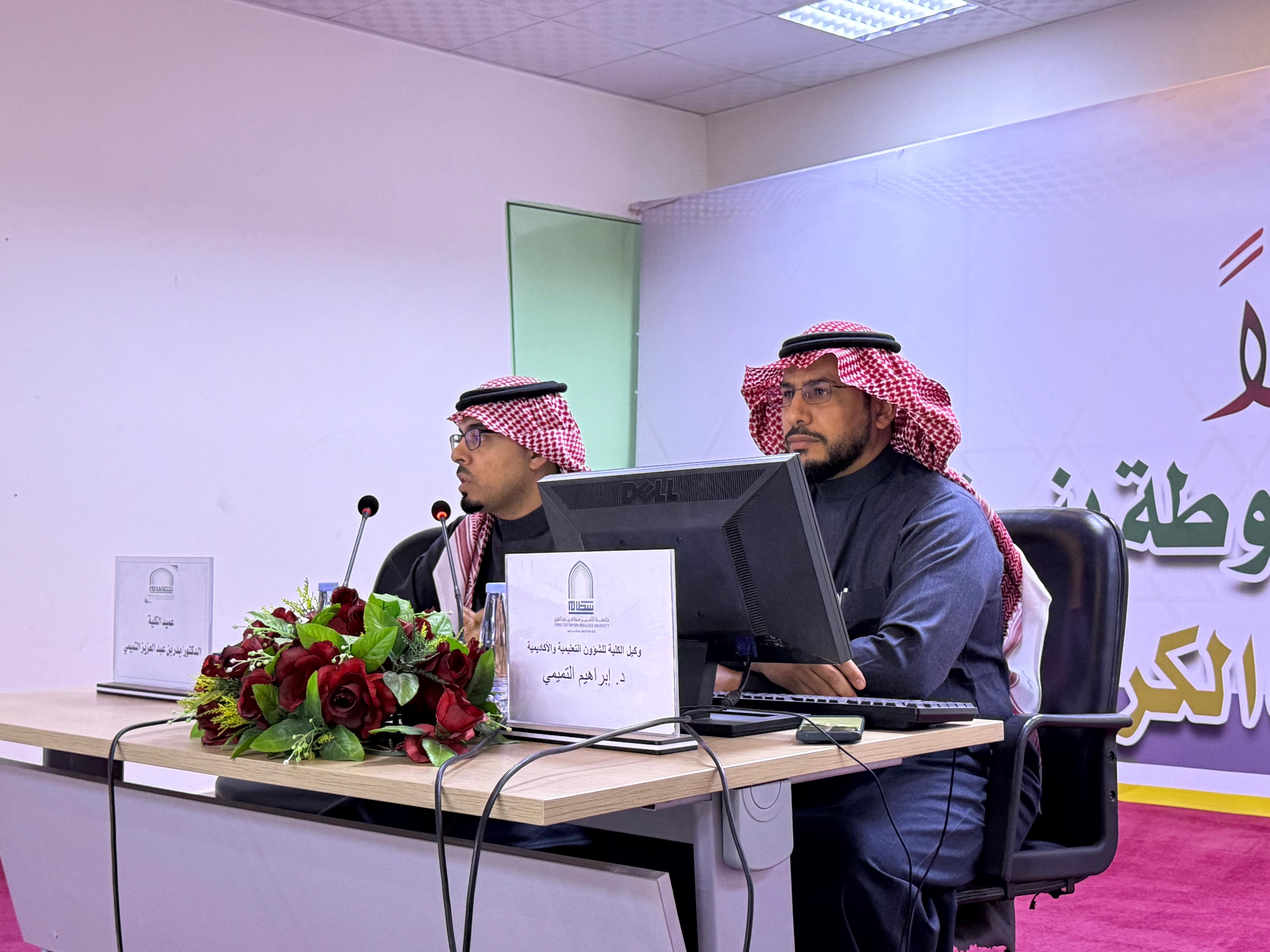 بعد ذلك تناول وكيل الكلية للشؤون الأكاديمية د. إبراهيم آل مسلّم التميمي آليّة الغياب والحرمان، وكيفية احتساب ذلك، وعن طريقة الاعتذار عن المقرر أو الفصل، أو تأجيل الفصل، وطريقة التقديم لذلك، وبيان موعده.