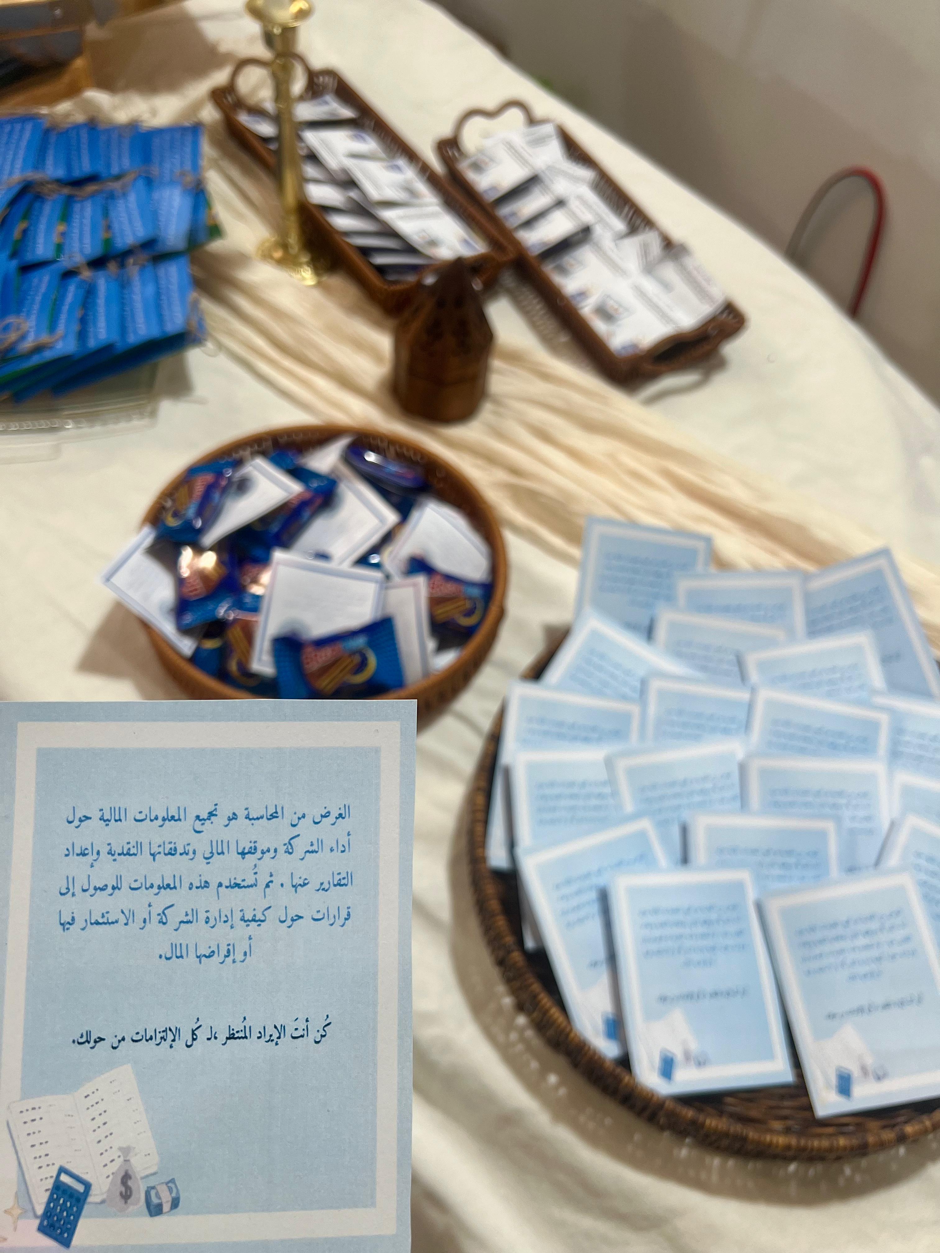 نظمت الكلية ممثلة بلجنة وحدة خدمة المجتمع يوم الأربعاء، الموافق 15/7/1446، "مبادرة الإرشاد المالي والمحاسبي" في ثانوية الحلوة للبنات. استهدفت المبادرة توجيه طالبات المدارس الثانوية نحو النجاح المهني والوعي المالي.