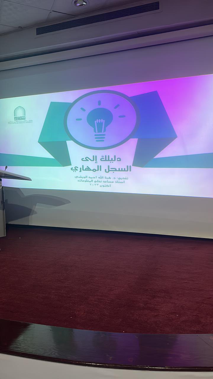 نظمت الكلية (شطر الطالبات) ورشة عمل تحت عنوان: (دليلك إلى سجلك المهاري)، قدمتها الدكتورة هبة الله الويشي عضو هيئة التدريس بالكلية، يوم الأحد 1445/4/2هـ.