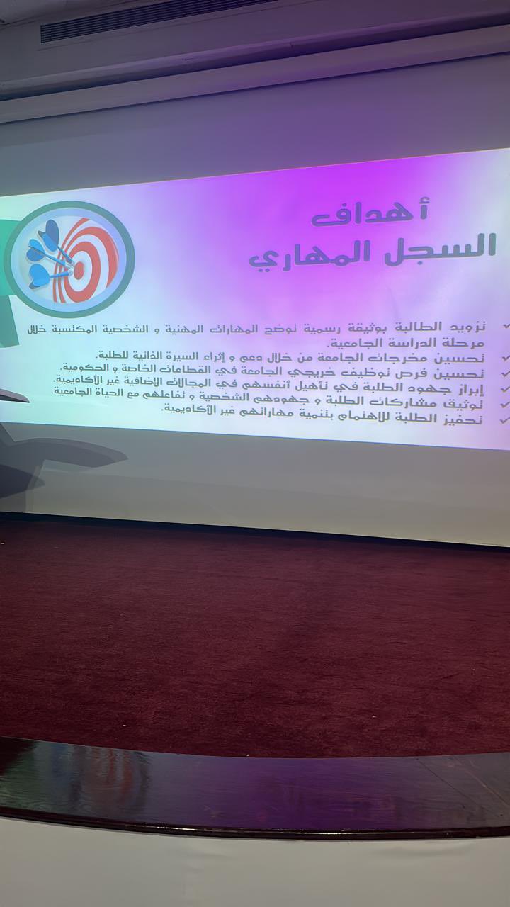 تضمنت الورشة تعريف الطالبات بالسجل المهاري، والذي يعد برنامجاً تدريبياً يهدف إلى تطوير مهارات الطالبات في مجالات مختلفة