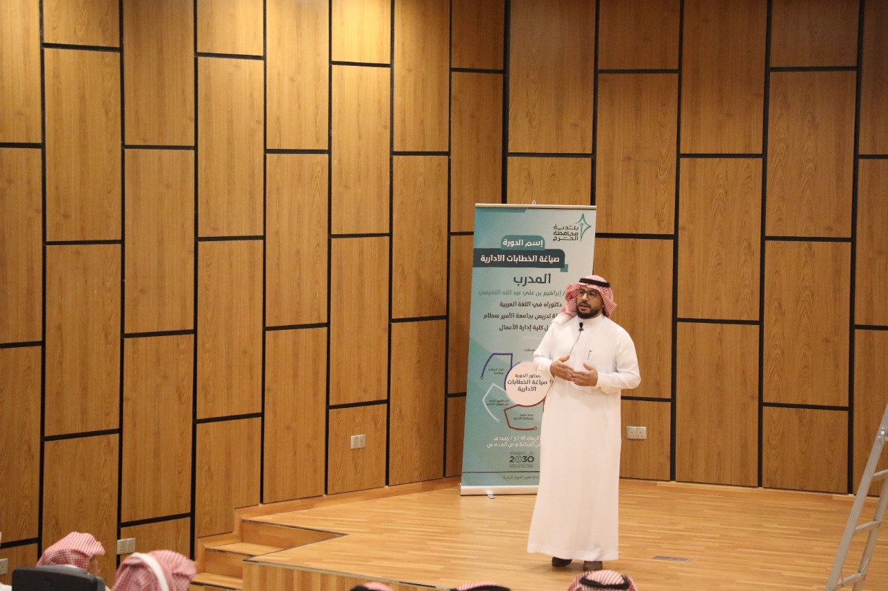 امتدادًا للبرامج التطوعية التي تقدمها كلية إدارة الأعمال في حوطة بني تميم خدمةً للمجتمع؛ قدّم وكيل الكلية للشؤون التعليمية والأكاديمية د. إبراهيم بن علي آل مسلّم التميمي برنامجًا تدريبيًّا، تحت عنوان: (صياغة الخطابات الإدارية وتحريرها)، لمنسوبي بلدية محافظة الخرج، يوم الأربعاء ١٤٤٤/٣/١٦هـ.