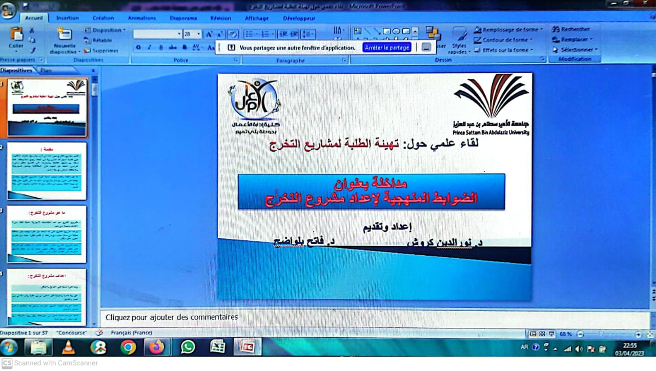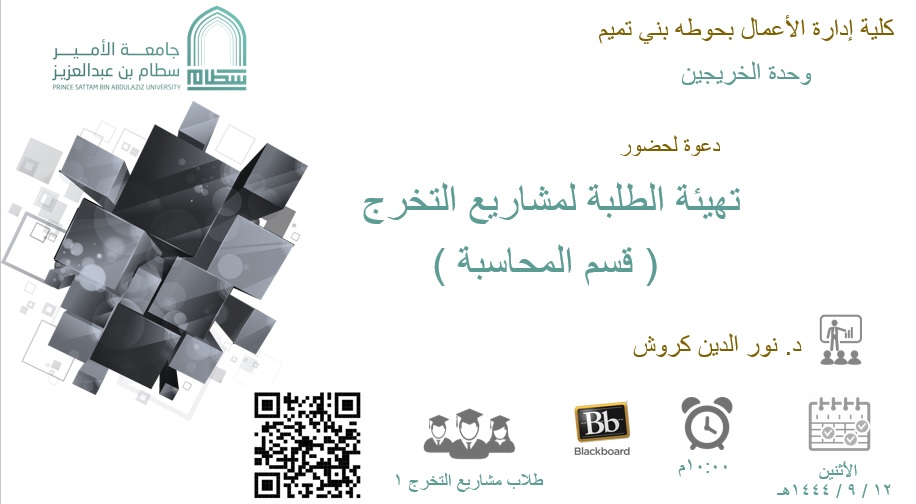 نظم قسم المحاسبة في الكلية لقاءً علميًّا تحت عنوان: (تهيئة الطلاب لمتطلبات مشروع التخرج)، قدمه مشرف القسم د. فاتح بلواضح، ود. نور الدين كروش الأستاذ المساعد في القسم، يوم الاثنين 12/٩/1444هـ.