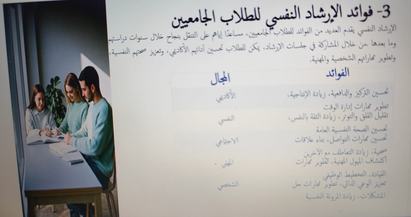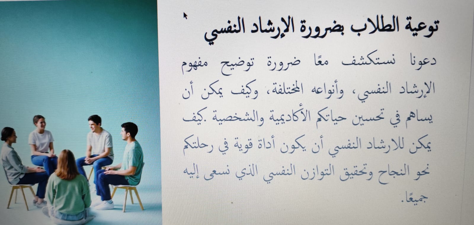كما تم تسليط الضوء على الطرق المختلفة التي يمكن من خلالها للطلاب الوصول إلى خدمات الإرشاد النفسي المتاحة في الكلية، وأهمية الاستفادة منها لتحقيق التوازن النفسي والنجاح الأكاديمي. وقد ساعد في تنظيم الحضور طالبات نشاط الجوالة، مما ساهم في تنظيم الفعالية بشكل سلس وناجح.