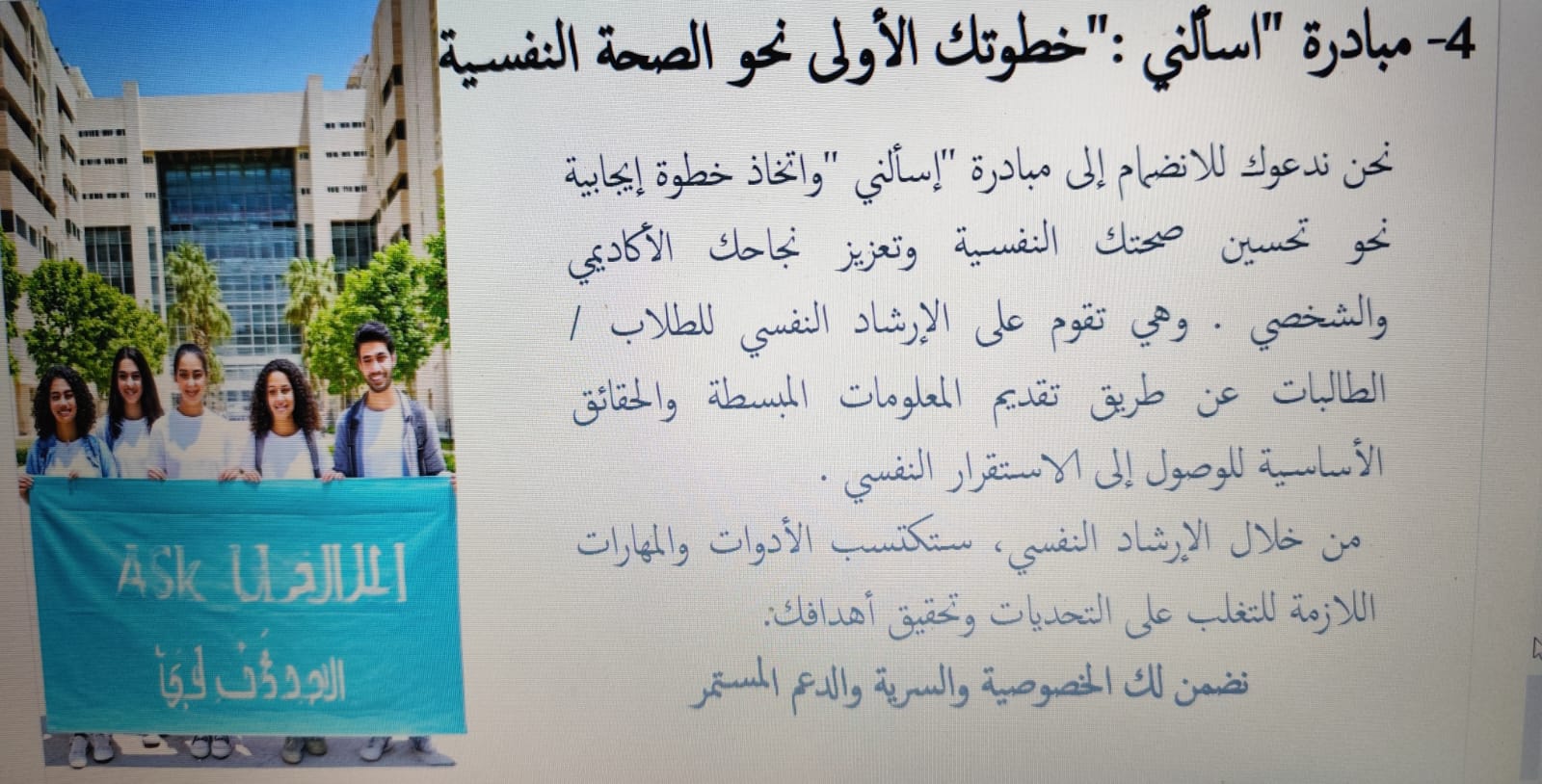 نظمت الكلية "شطر الطالبات" ممثلة بلجنة التوجيه والإرشاد، بإشراف د. رباب حمدي جميل، يوم الثلاثاء الموافق 5/4/1446 هجريًا، مبادرة “اسألني” التي تهتم بتوعية الطلاب بضرورة الإرشاد النفسي وكيف يمكن أن يكون أداة قوية في رحلتهم نحو النجاح وتحقيق التوازن النفسي.