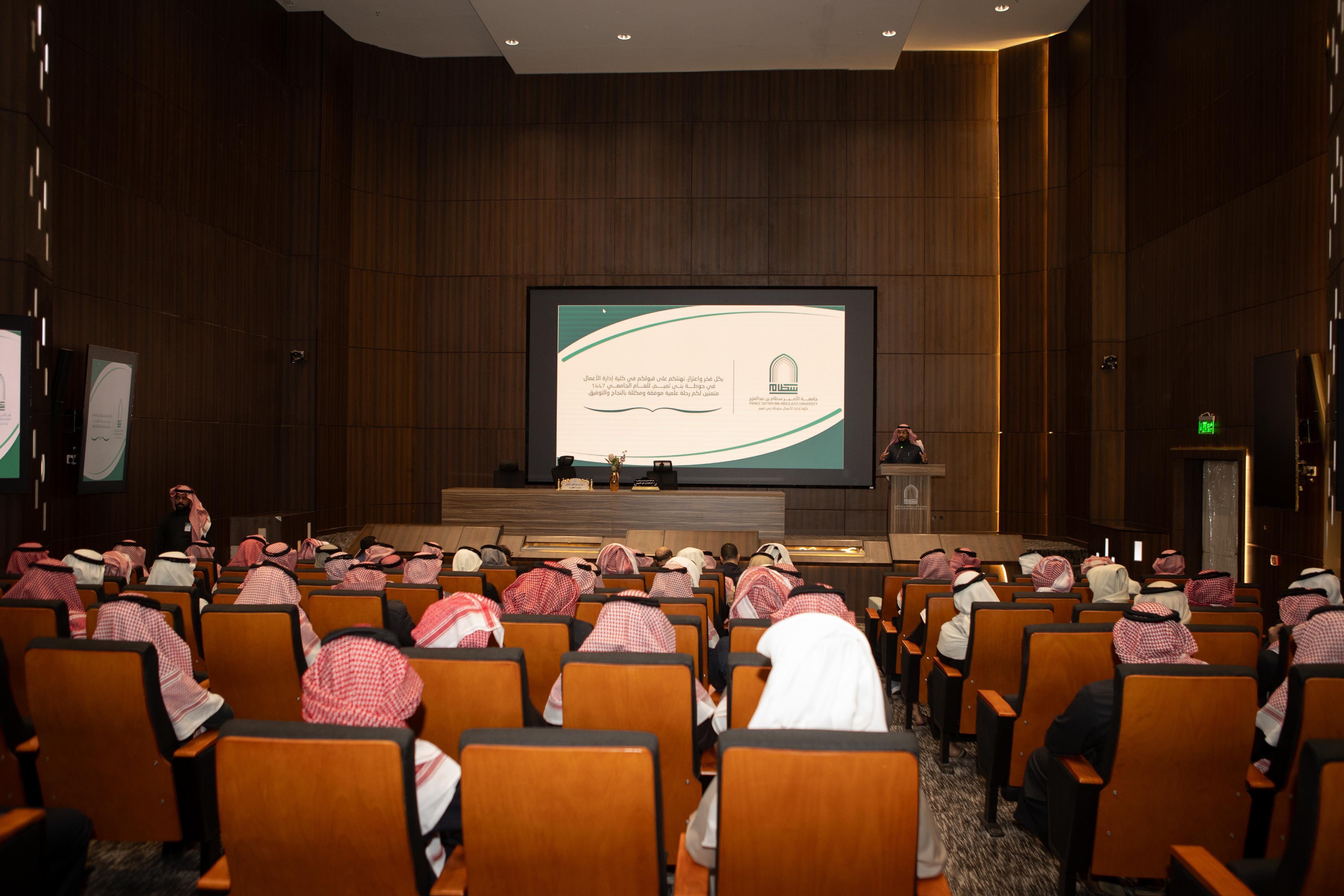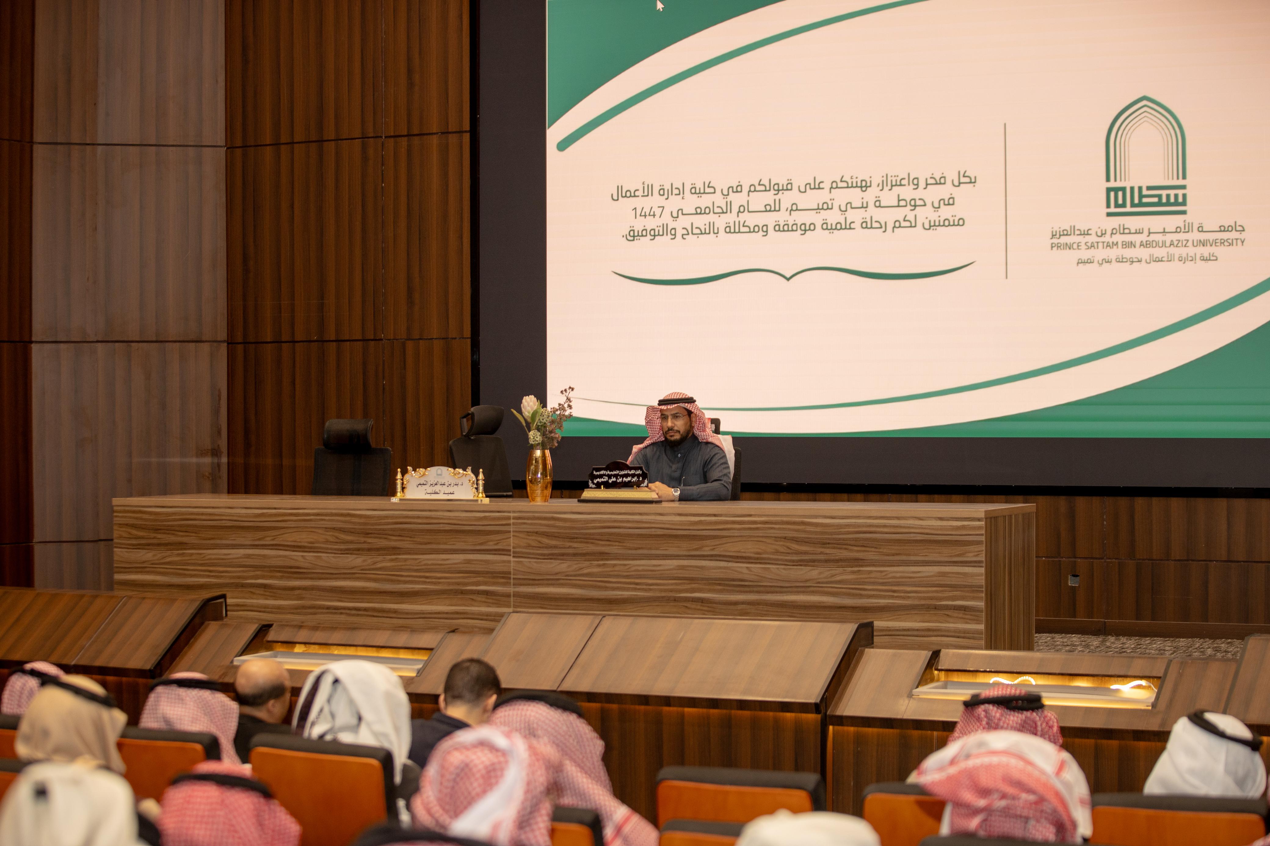 عقد عميد الكلية د. بدر بن عبدالعزيز التميمي لقاءً بالطلاب المستجدين يوم الاثنين 7/8/1447هـ. واستهلّ د. التميمي اللقاء بالترحيب بالطلاب وتهنئتهم بقبولهم في الكلية، داعيًا لهم بالتوفيق والسداد في مسيرتهم الجامعية.