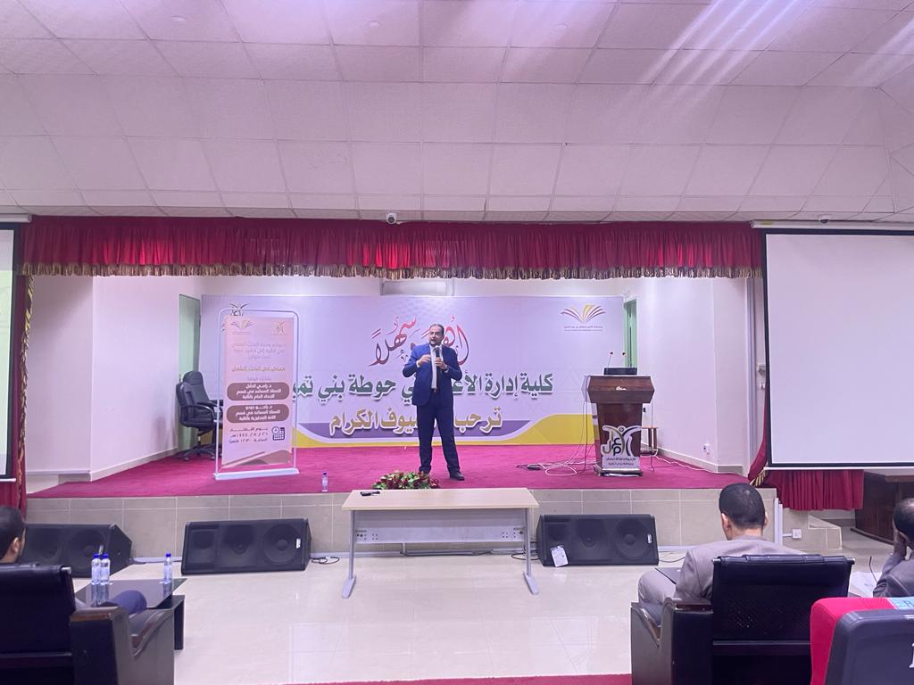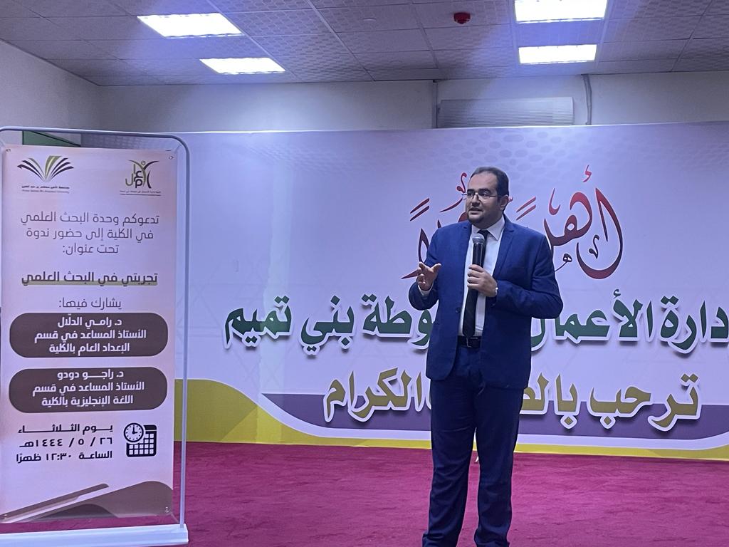 نظمت الكلية ممثلة بوحدة البحث العلمي ندوة تحت عنوان: (تجربتي في البحث العلمي)، شارك فيها د. رامي الدلّال الأستاذ المساعد في قسم المحاسبة، ود. راجو دودو الأستاذ المساعد في قسم اللغة الإنجليزية، يوم الثلاثاء ١٤٤٤/٥/٢٦هـ.