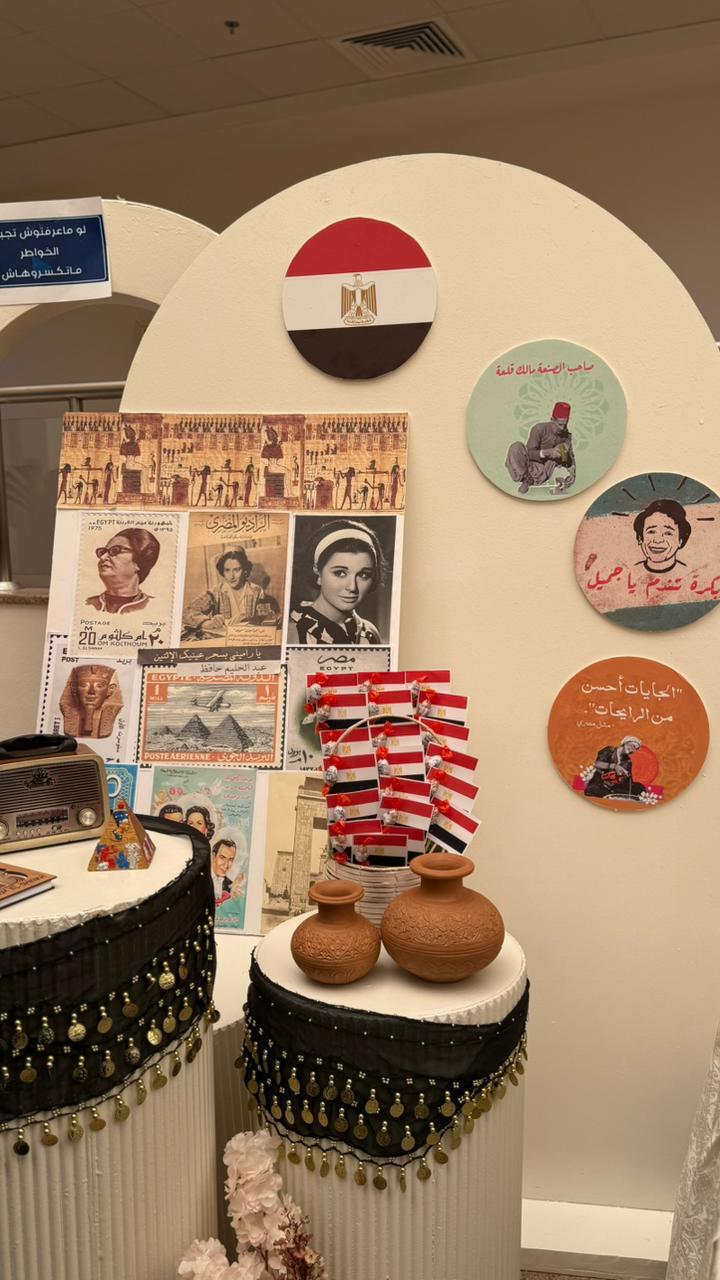 وقدمت طالبات الكلية نموذجاً مميزاً لعرض الثقافة المصرية، من خلال إعداد أكلات شعبية وحلويات مصرية، وتصميم ديكورات وزينة مستوحاة من التراث الفرعوني، إضافة إلى توثيق الفعالية بالتصوير وتقديم توزيعات تراثية جذبت اهتمام الحضور.