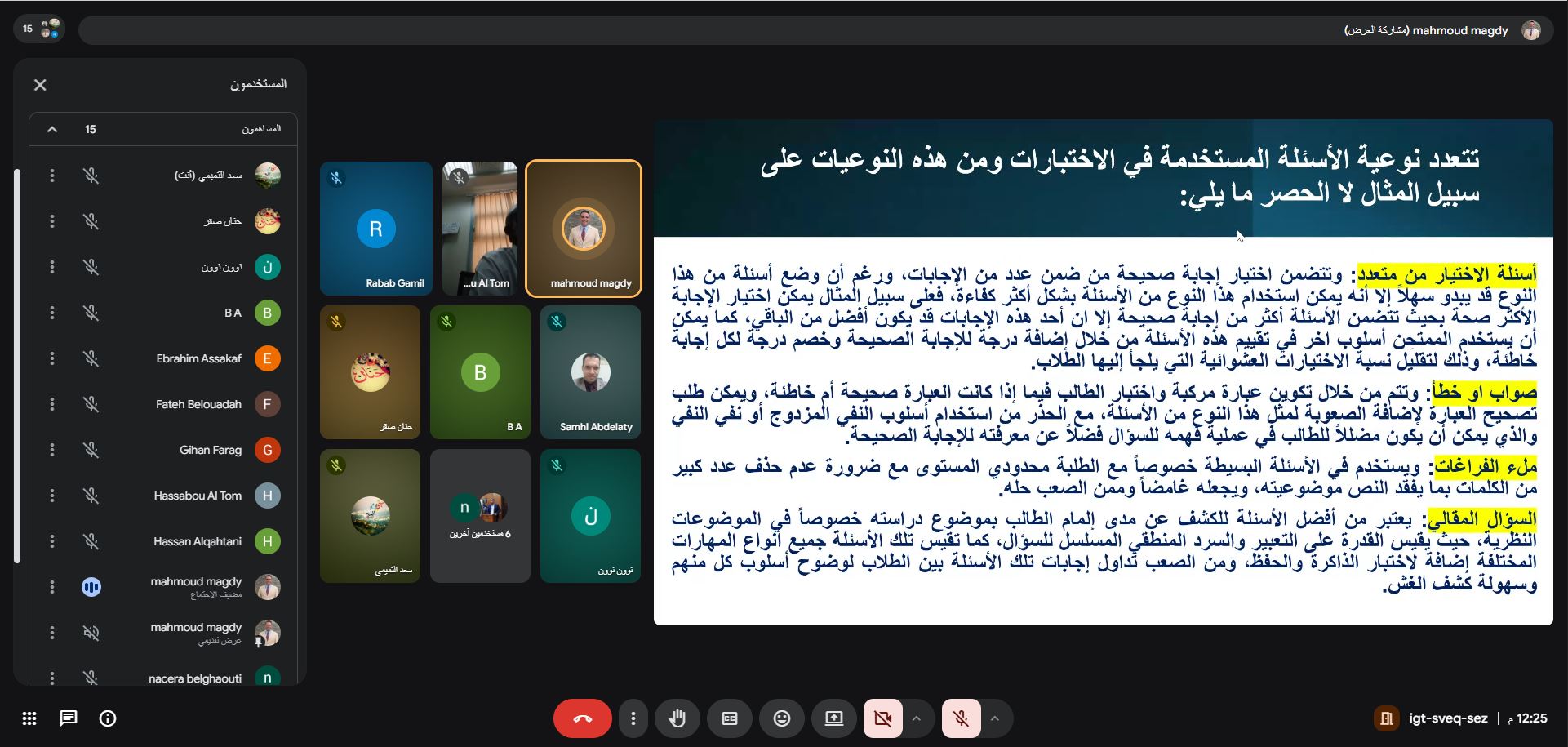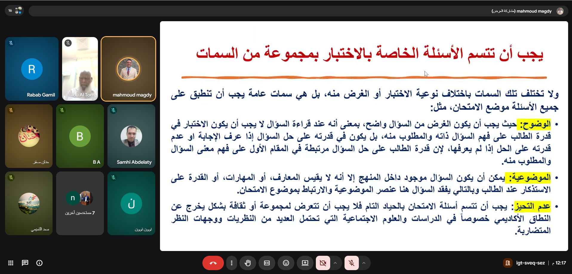 وتناولت الورشة أسس إعداد الاختبارات الجيدة، وأنواع الأسئلة وطرق صياغتها، وربطها بمخرجات التعلم، إضافة إلى تجنب الأخطاء الشائعة ودور التقييم في دعم تعلم الطلبة. كما شملت أمثلة تطبيقية ونقاشات حول التحديات التي تواجه أعضاء هيئة التدريس في إعداد الاختبارات.