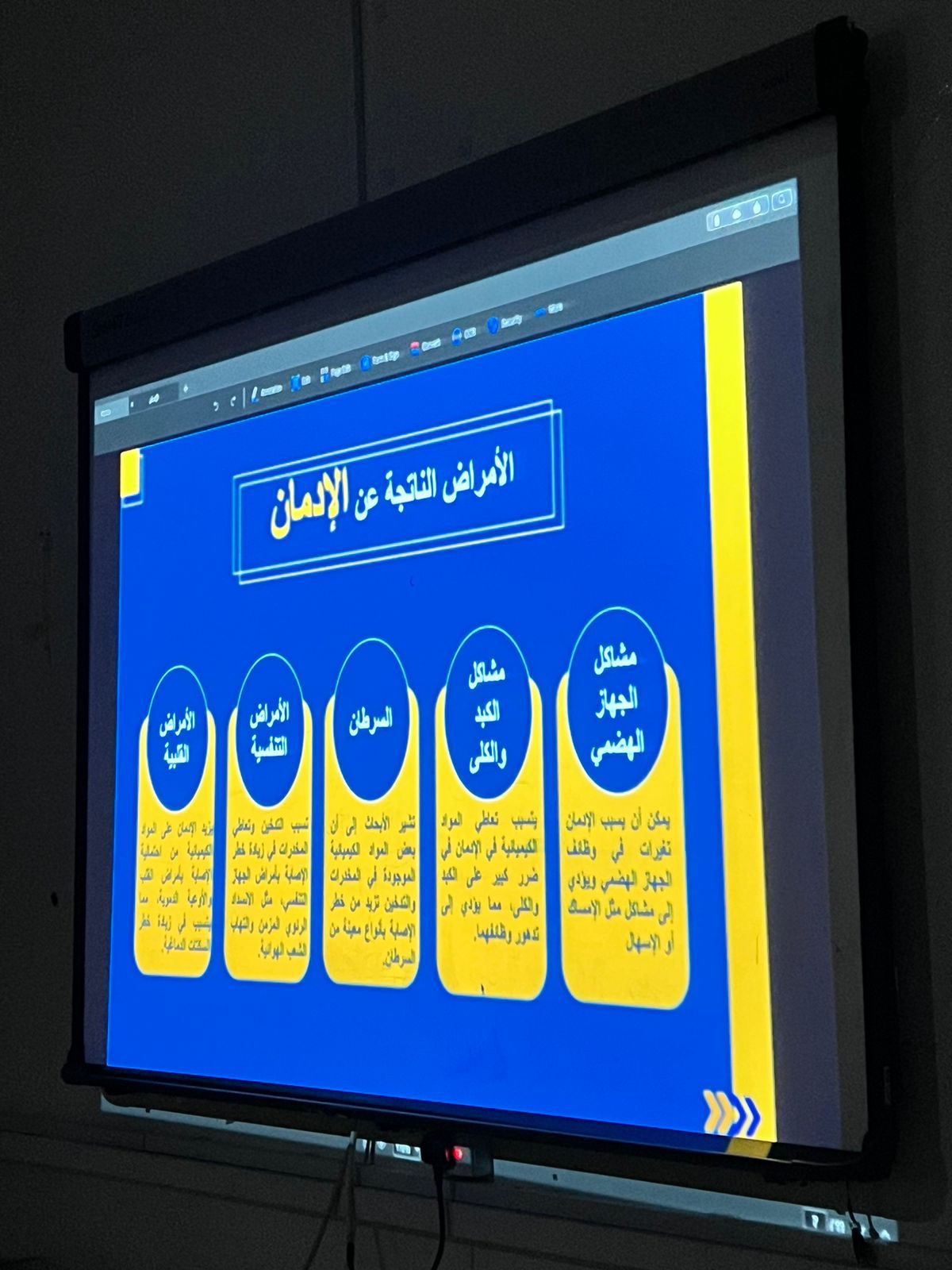 On the following day, the committee organized a program about addiction and its dangers, presented and prepared by students of the College of Business Administration, on Monday, corresponding to 2/8/1445 AH, at the college theater. The program addressed various topics about the causes leading to addiction and drug abuse, and the serious risks that affect individuals, families and communities alike, and how to deal with addicts and help them recover and rehabilitate.