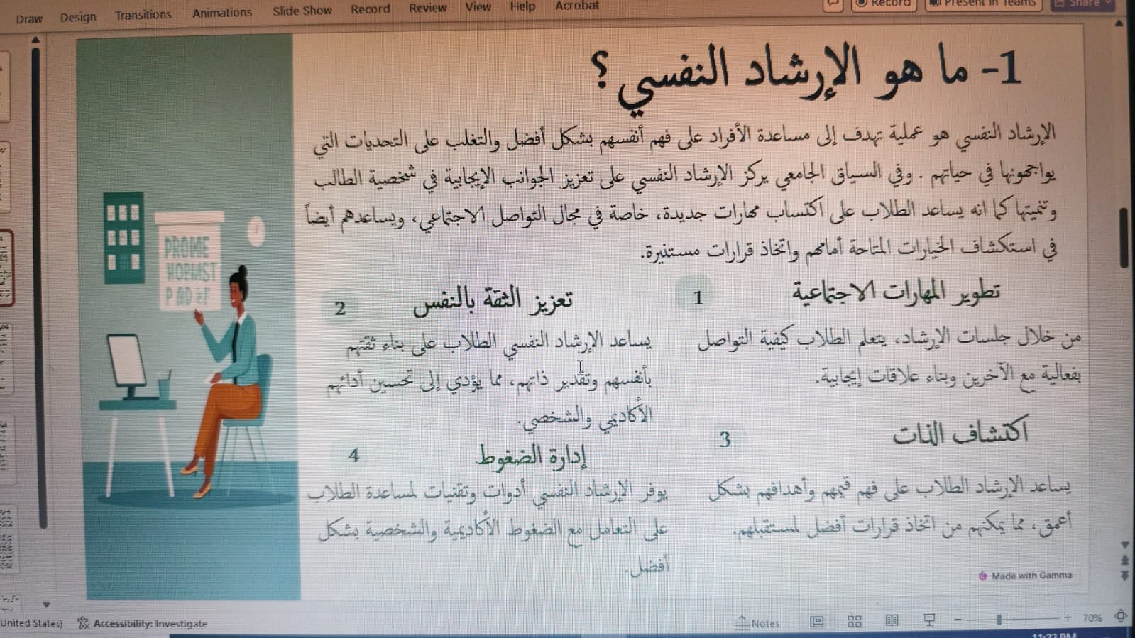 The lecture covered the definition of psychological counseling, its types, and its benefits for university students. It also encouraged students to improve their mental health by acquiring the necessary skills to overcome challenges and achieve their goals. The students actively participated in enriching the lecture with numerous valuable discussions.