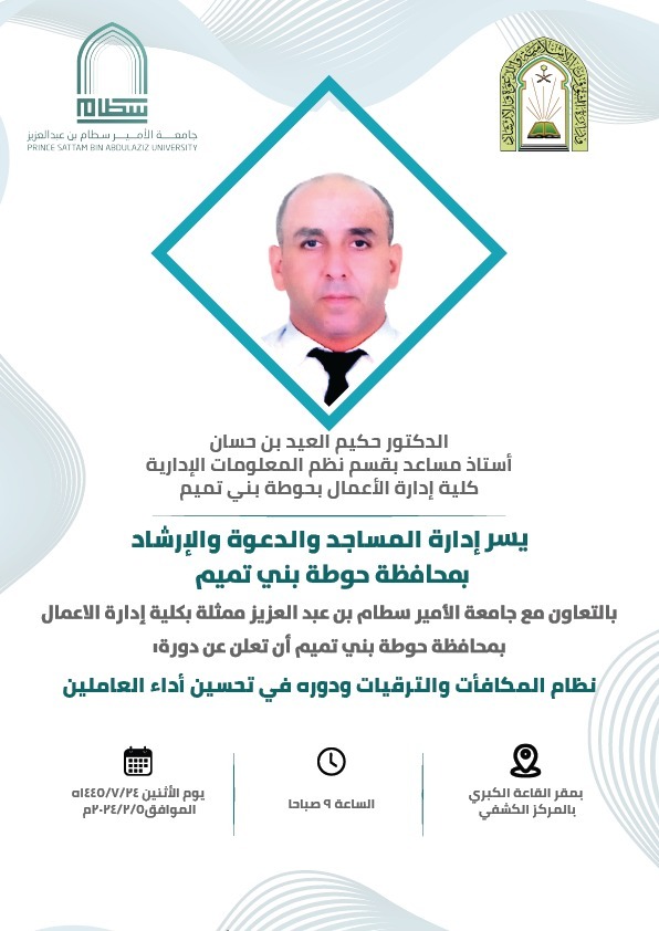 The program was presented by Dr. Hakim Al-Eid bin Hassan, Professor of Administrative Information Systems at the College, and the program targeted the employees of the Department of Mosques, Da'wah and Guidance in the governorate, and the program addressed the concept of promotion, its types, conditions, effects on employees and the organization, and how to apply the promotion system in a fair, transparent and effective manner.