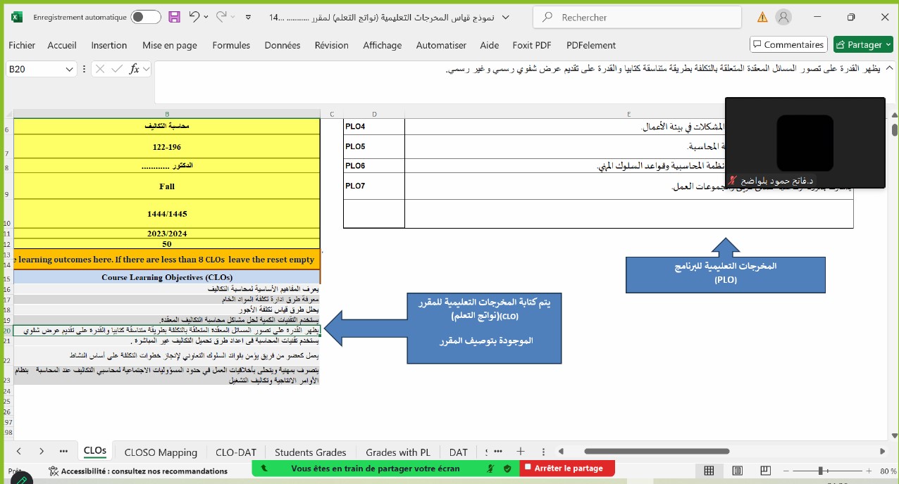 The college, represented by the Department of Accounting, organized a workshop on Wednesday, 17th Jumada al-Akhirah 1446 AH, via the Zoom virtual platform. The workshop, titled "How to Measure Learning Outcomes and Prepare Course Reports," was presented by Dr. Fateh Hamoud Blawadh, Assistant Professor in the Department of Accounting.