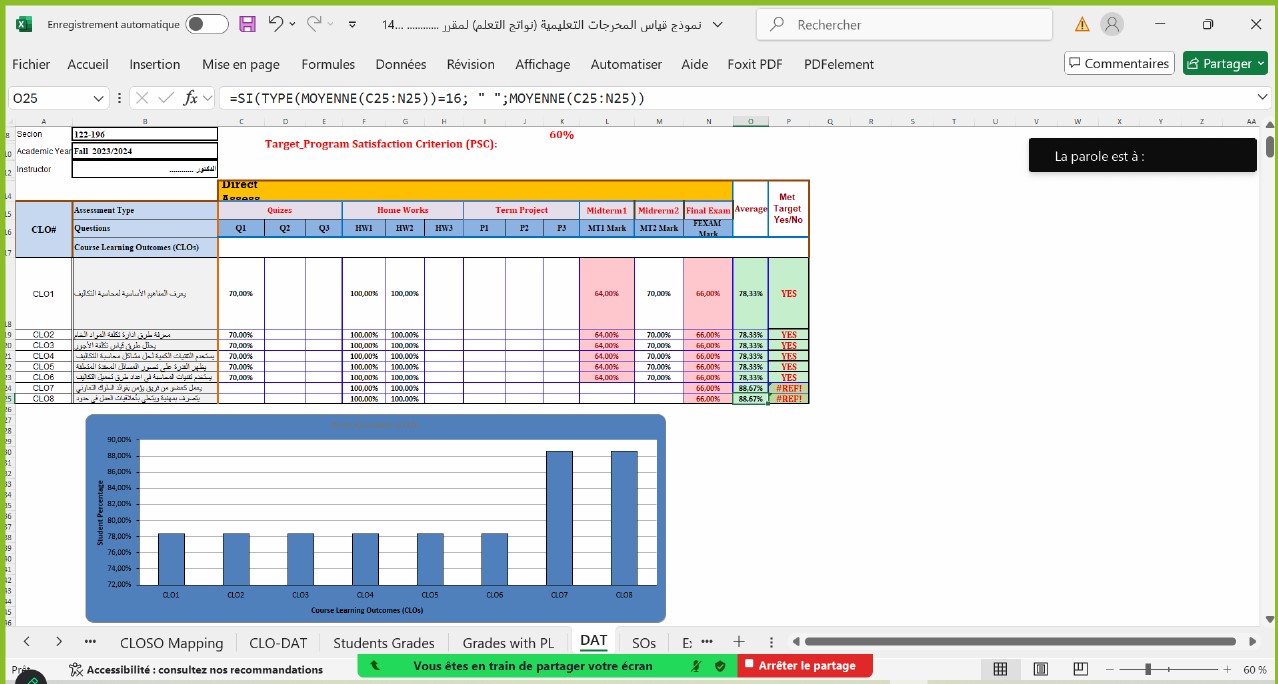 The workshop aimed to develop participants' skills in measuring and evaluating learning outcomes for courses. During the workshop, participants reviewed the models of the Evaluation and Training Authority (2024 edition) for course descriptions and reports. They explained the main components and highlighted the relationship between course descriptions and reports when measuring course learning outcomes. Additionally, a practical application was conducted on how to measure the learning outcomes of an accounting course using a designated Excel sheet, followed by preparing the course report and developing an improvement plan.