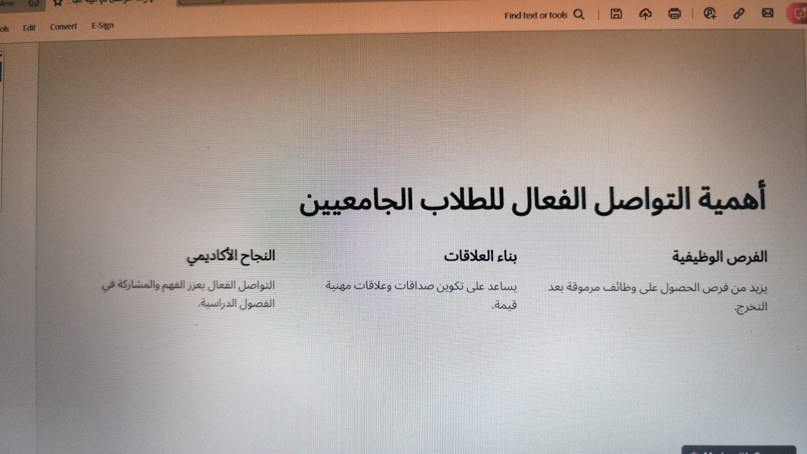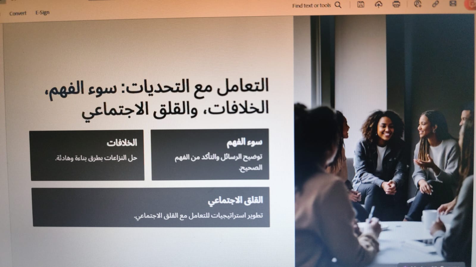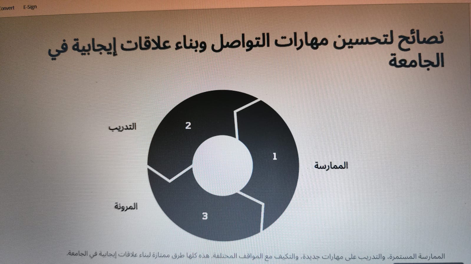 The lecture covered the definition of communication skills in the university environment, the importance of this communication among students, the types of communication, and how to deal with challenges arising from the lack of communication skills. It also provided tips for students to improve their communication skills and build positive relationships in the university. The students actively participated in enriching the lecture with numerous valuable discussions.