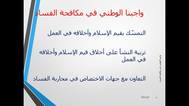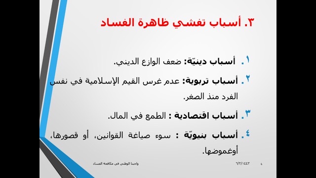 وقد تناول د. خالد الذيابي في المحاضرة مفهوم الفساد، مشيرًا إلى أنواعه: الفساد المالي، والفساد الوظيفي، والفساد السلوكي، والفساد الأخلاقي، ومحذّرًا من ارتكابه، أو التعامل مع أصحابه.