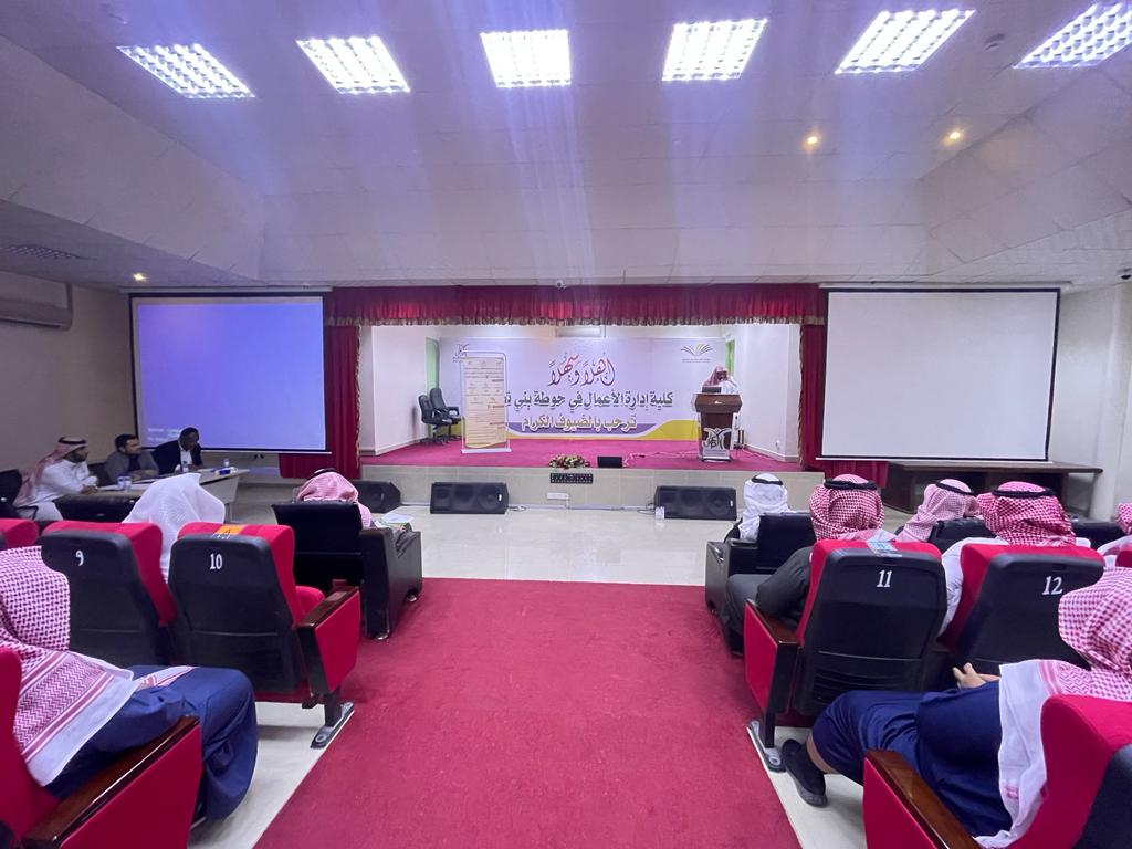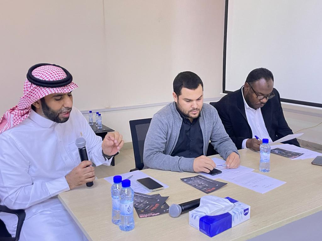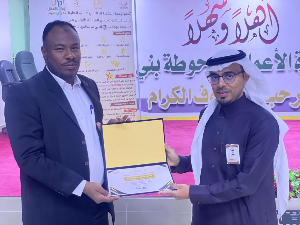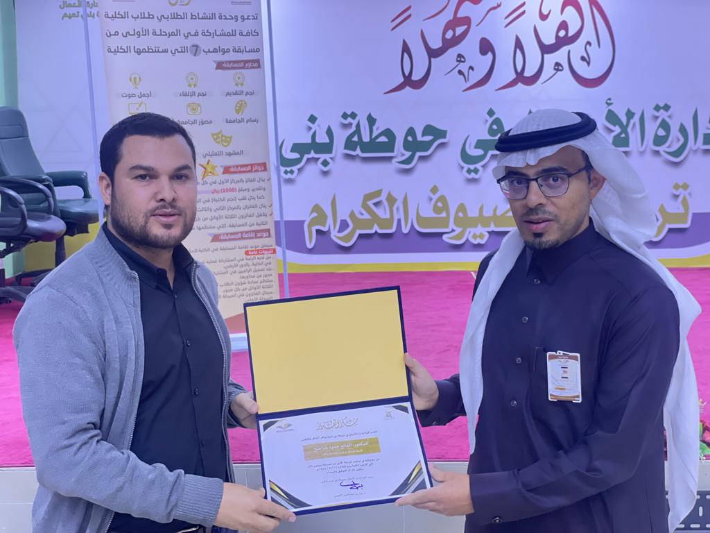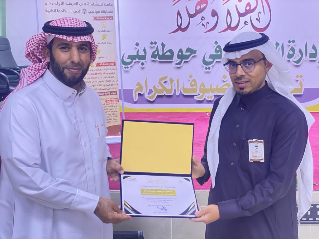 The Student Activities Unit organized the arbitration proceedings of the first phase of the talent competition (7)Tuesday 1444/5/19 , in the presence of the Acting Dean of the College, Dr. Badr Al-Tamimi and the Vice Dean for Educational and Academic Affairs, Dr. Ibrahim Al Muslam Al Tamimi. A number of college students competed in the various axes of the competition, and each contestant presented his contribution to the arbitrators and the audience. After that, the dean in charge listened to the committee notes and directions regarding contestants’ performance. Worth mentioning that the competition was refereed by a committee consisting of three faculty members: Dr. Ibrahim bin Muhammad Al-Musallam, Dr. Fateh Belwadeh, and Dr. Abdul Wahid Al-Tayeb. At the end of the competition, Dr. Badr Al-Tamimi thanked the arbitrators, giving them certificates of appreciation.