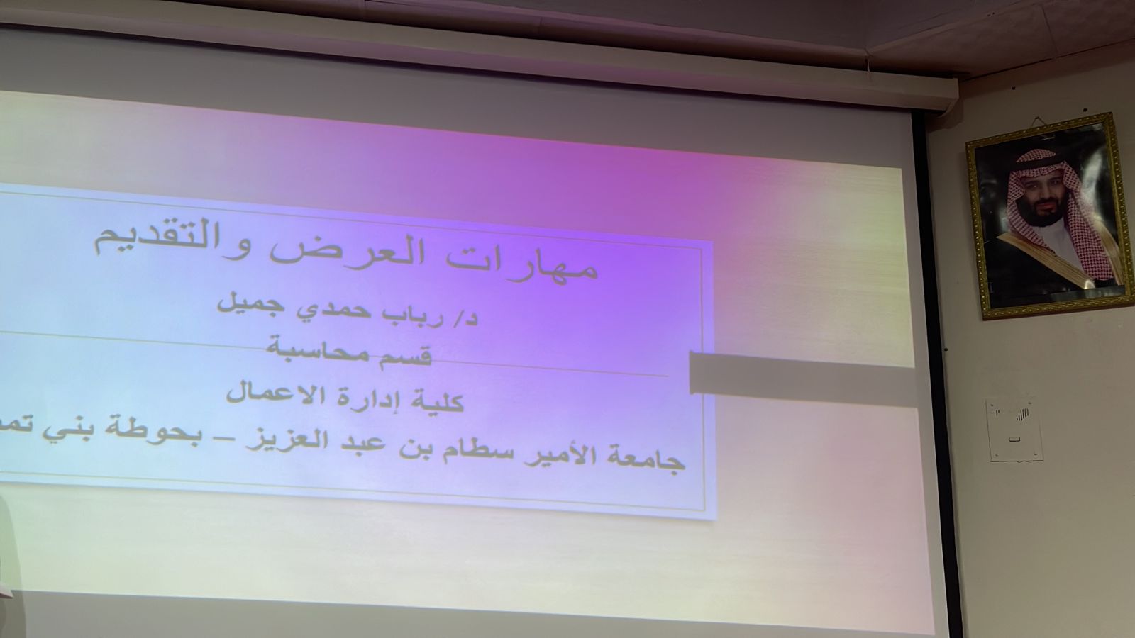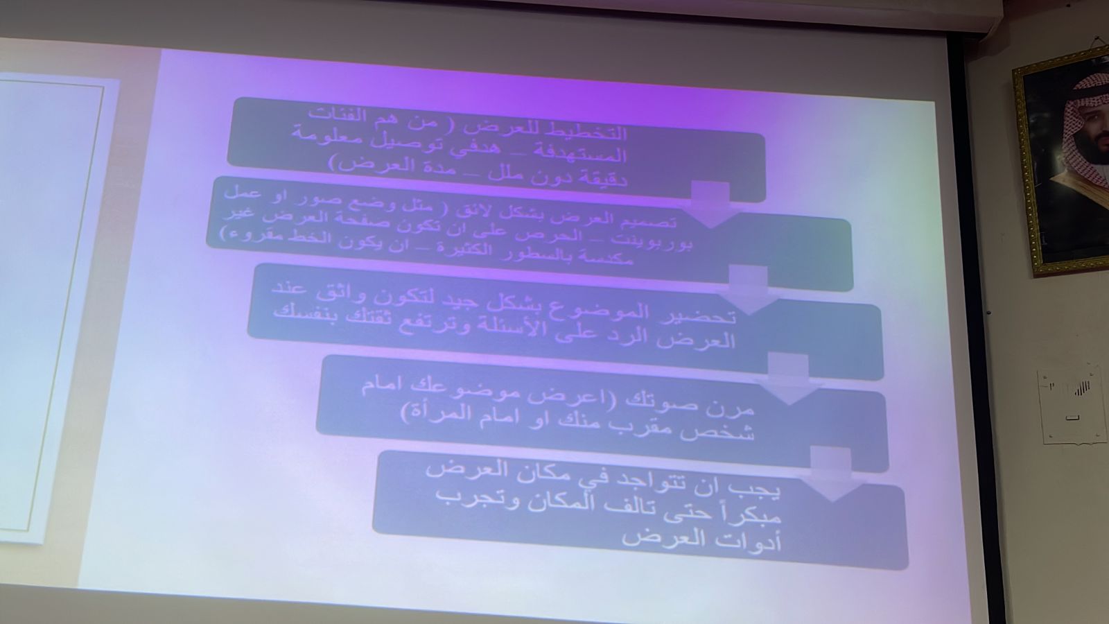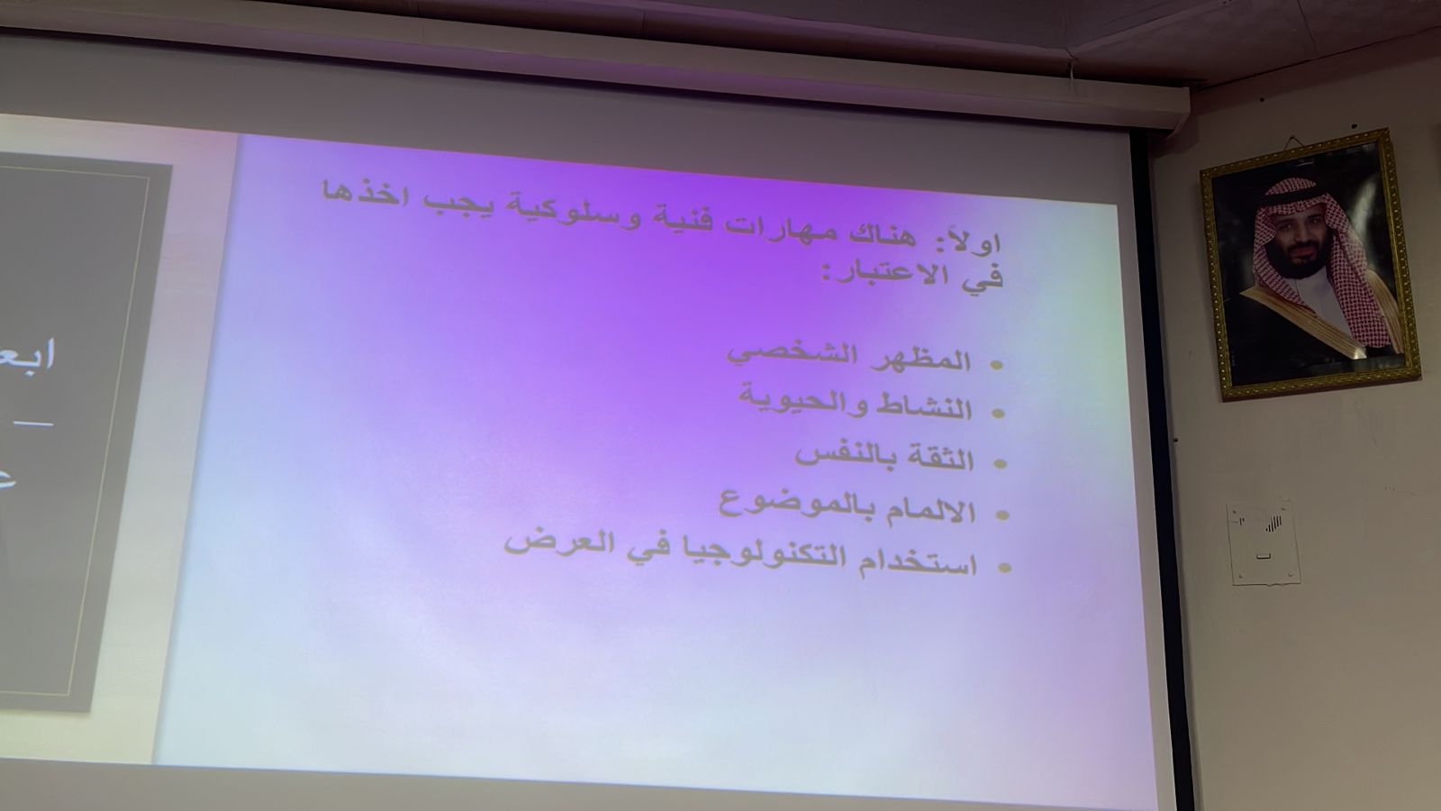The Student Activities Unit at the college organized a workshop titled "Presentation Skills" on Monday, corresponding to 22/8/1445 AH, presented by Dr. Rabab Hamdi. The workshop discussed the importance of presentation skills for university students and effective presentation methods, in addition to how to prepare topics and present them correctly. The program included a display of illustrative images for the correct and incorrect methods of presentation. The meeting was distinguished by a spirit of enthusiasm and significant interaction from the attendees, which emphasized the importance of the topic and the need to develop this skill among the students