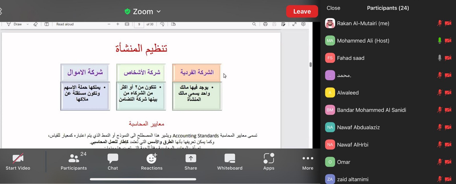 The Department of Accounting at College held a remote training program, under the title Basics of Financial Accounting. The program has been presented by Mr. Muhammad bin Ali Al-Ghamdi, teaching assistant in the department, on Monday 24/10/1444 AH.
