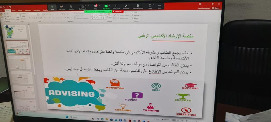 The workshop was presented by Dr. Noureddine Karouche and Dr. Fateh Belwadheh from the Department of Accounting. The workshop presenters discussed the concept and importance of academic advising and the role of the academic advisor in guiding and assisting students. They also showed students and faculty members how to use the digital platform, which is an effective tool for communication and interaction between the advisor and students, in the process of advising.