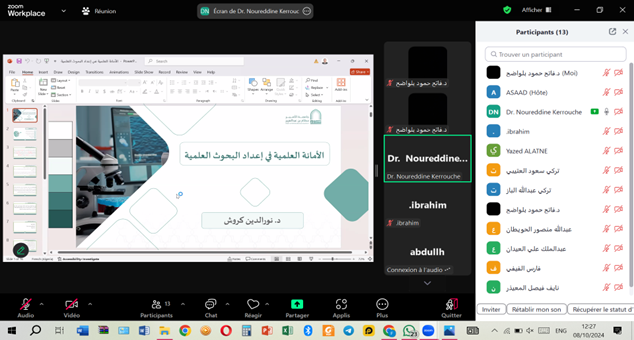The college, represented by the Scientific Research Unit, organized a training workshop titled “Preparing Graduation Project Students in the Department of Accounting” on Tuesday, October 8, 2024, via the ZOOM platform. The workshop targeted graduation project students in the department, with 13 students enrolled in Graduation Project 1 participating.