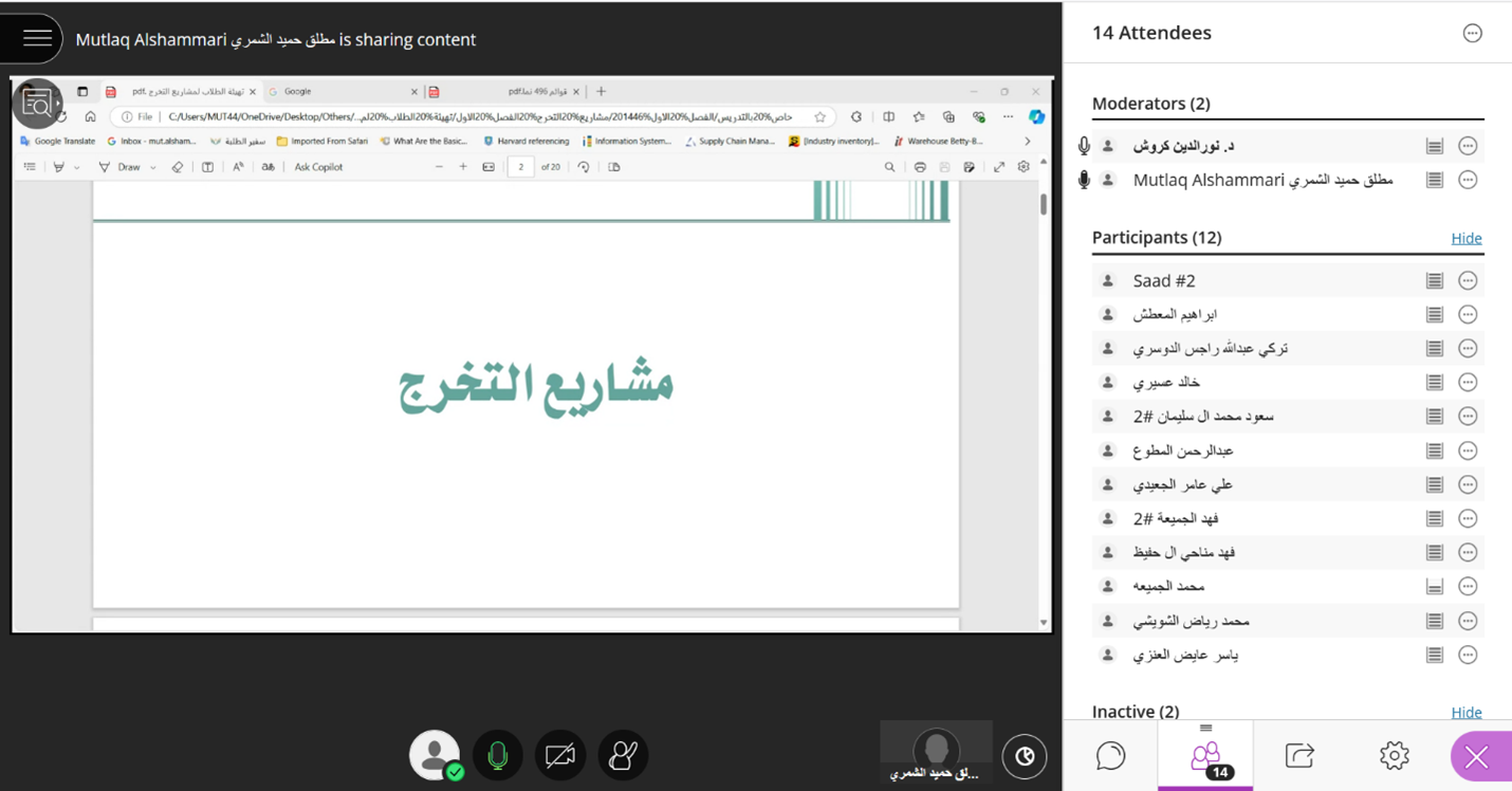 The college, represented by the Scientific Research Unit, organized a training workshop titled "Preparing Graduation Project Students in the Department of Management Information Systems" on Thursday, September 26, 2024, via ZOOM. The workshop targeted graduation project students in the department, with several students enrolled in Graduation Project 1 participating.