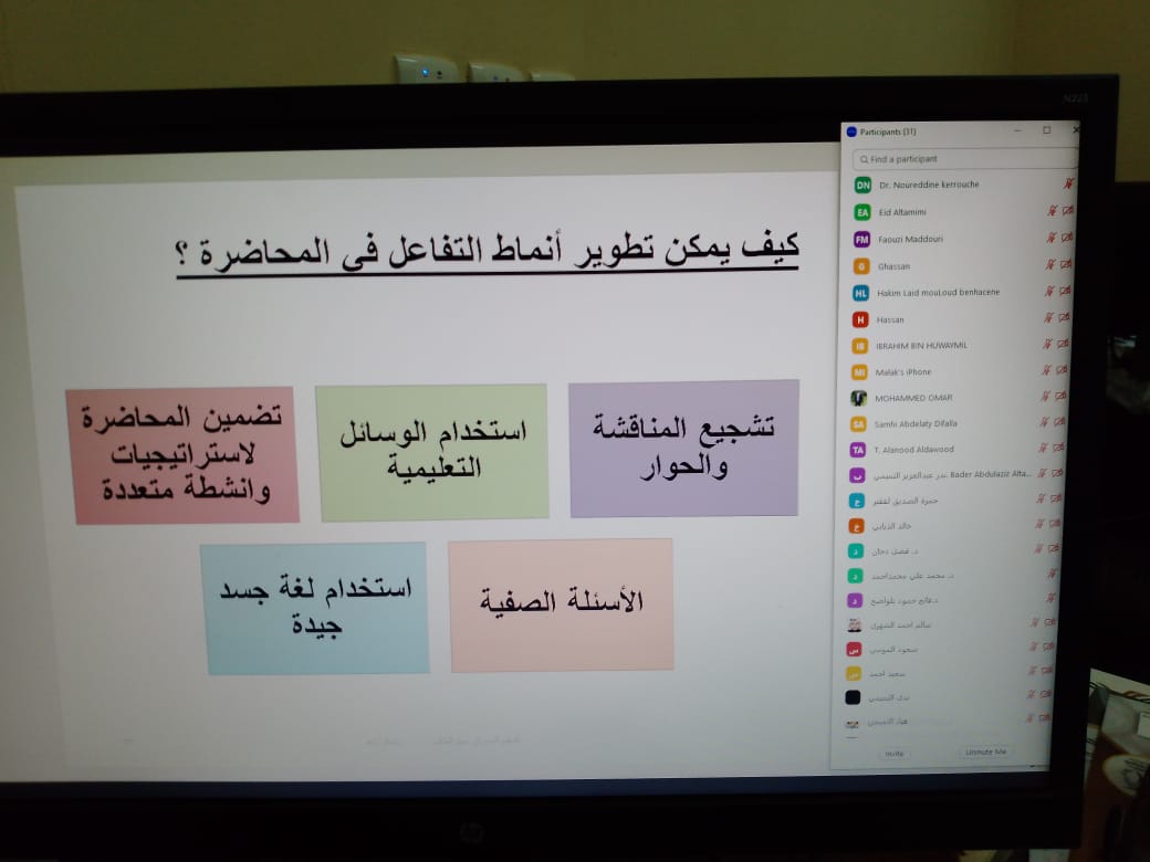 The program included a talk about the concept and importance of teaching strategies, foundations and specifications of student-centered education, and means of developing traditional teaching. The program also included practical applications that center on student-centered strategies and the basic skills of the lecturer.