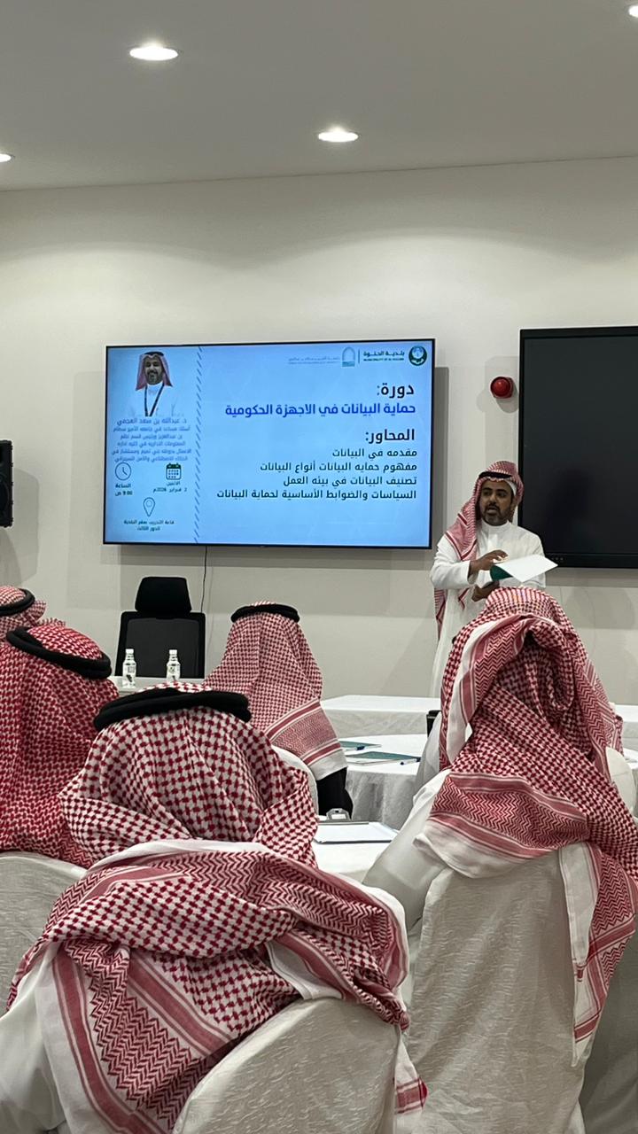 The college, represented by the Community Service Unit, organized a training program titled “Data Protection in Government Agencies” on Monday 15/8/1447 AH, targeting employees of Al‑Hilwah Municipality. The program was delivered by Dr. Abdullah bin Saad Al‑Ajmi.